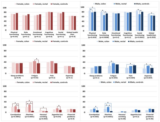 Among the male participants, rectal cancer survivors reported the lowest levels of functioning, namely in the domains of physical functioning (versus colon cancer survivors), and role and social functioning in comparison with colon cancer survivors and controls (Figure 5). In contrast, male colon cancer survivors reported better physical functioning and global health/QOL than male controls. Male rectal cancer survivors tended to report higher levels of symptom burden than male colon survivors or controls, notably for fatigue, dyspnea, constipation, and diarrhea. Male colon cancer survivors reported lower levels of pain but higher levels of diarrhea when compared with male controls.