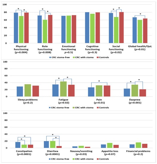 Mean EORTC QLQ-C30 scores of colorectal cancer (CRC) survivors with and without permanent stoma, and controls. Models are adjusted for age at survey, sex, and education. The p-values shown indicate the global comparison between cancer survivors with and without stoma and controls. The line spans and asterisks (*) indicate the subgroups that showed significant differences in pairwise comparison. For example, the line span for global health/QOL is across three columns, indicating that stoma-free CRC survivors reported significantly higher global health/QOL when compared with controls. All results are based on 25 imputations of missing values.