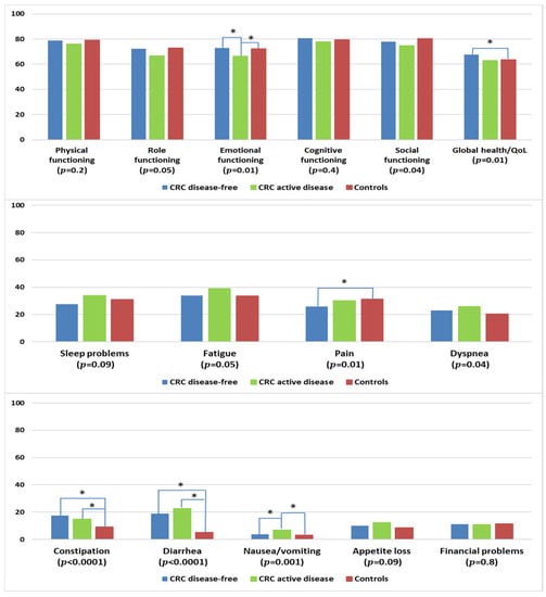 Mean EORTC QLQ-C30 scores of colorectal cancer (CRC) survivors by disease status, and controls. Models are adjusted for age at survey, sex, and education. Disease-free: stage I–III at diagnosis and remaining disease-free at follow-up according to self-report; active disease: stage IV at diagnosis or reported subsequent recurrence, metastasis, or primary cancer. The p-values shown indicate the global comparison between cancer survivors with and without active disease and controls. The line spans and asterisks (*) indicate the subgroups that showed significant differences in pairwise comparison. For example, the line span for global health/QOL is across three columns, indicating that disease-free CRC survivors reported significantly higher global health/QOL when compared with controls. All results are based on 25 imputations of missing values.
