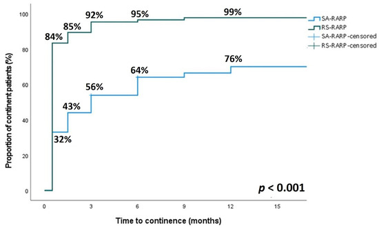 At every postoperative time point, continence was significantly better in the RS-RARP group compared to the SA-RARP group. The two-week continence rate in the RS-RARP group (84%) is higher compared to previously published data, in which early continence rates of 51–76% have been reported [7,9,16,17,18]. Since our definition of continence was similar to other published data [9,15,19,20,21,22], this could be due to small differences in surgical approach and techniques, which we described in detail previously [11].