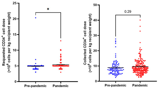 Requested and collected CD34+ cell doses per kg recipient weight in pre-pandemic and pandemic collections. N = 291. Means indicated ± SEM. * = p < 0.05.