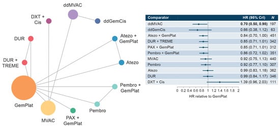 Network diagram and HR for PFS by treatment network for the cis-eligible/mixed network. Abbreviations: Cis, cisplatin; CrI, credible interval; ddGemCis, dose-dense gemcitabine + cisplatin; ddMVAC, dose-dense methotrexate + vinblastine + doxorubicin + cisplatin; DUR, durvalumab; DXT, docetaxel; GemPlat, gemcitabine + platinum (cisplatin or carboplatin); HR, hazard ratio; MVAC, methotrexate + vinblastine + doxorubicin + cisplatin; PAX, paclitaxel; Pembro, pembrolizumab; PFS, progression-free survival; TREME, tremelimumab.