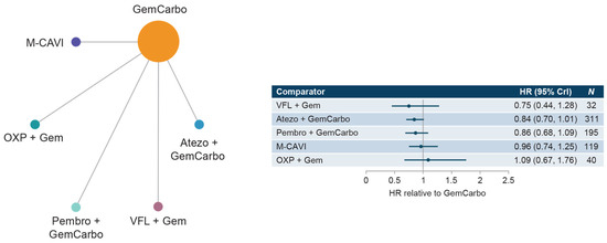 Network diagram and HR for PFS by treatment network for the cis-ineligible (strict) network. Abbreviations: CrI, credible interval; Gem, gemcitabine; GemCarbo, gemcitabine + carboplatin; HR, hazard ratio; M-CAVI, methotrexate + carboplatin + vinblastine; OXP, oxaliplatin; PFS, progression-free survival; VFL, vinflunine.