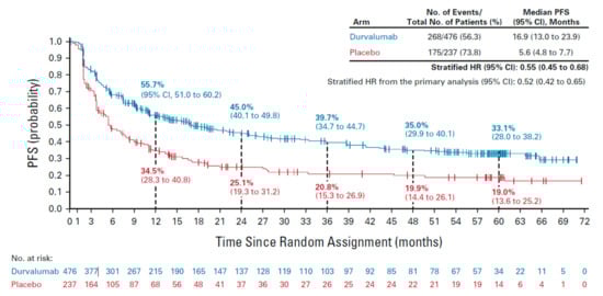 Clinical Rationale: Patients with stage III, unresectable NSCLC have the highest risk of disease relapse in the first year after completion of CRT independent of whether durvalumab consolidation therapy is received [13]. In the PACIFIC trial, rates of progression-free survival (PFS) were 55.7% with CRT + durvalumab and 34.5% with CRT alone at one year of follow-up, 45.0% and 25.1% at two years, 39.7% and 20.8% at three years, 35.0% and 19.9% at four years, and 33.1% and 19.0% at five years (Figure 1) [13]. Accordingly, for most patients, initiation of routine imaging and other assessments is imperative to monitor for signs and symptoms indicative of disease recurrence or progression such that timely and appropriate treatment can be provided [6,16,17,18]. Early detection of recurrent or metastatic disease may allow for early intervention and consideration of a broad range of management options [31,32].