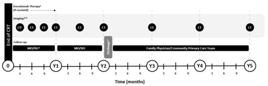 Given these findings, the expert working group recommended that imaging frequency should vary over time in accordance with the year-over-year risk of progression after CRT and the need for close monitoring while patients are actively receiving durvalumab. As such, for patients proceeding with durvalumab consolidation therapy, imaging should first be conducted two-to-four weeks after completion of CRT and before initiation of durvalumab; subsequent imaging should occur every three months for the full duration of durvalumab therapy, which is typically one year (Figure 2) [11]. For patients not initiating durvalumab, imaging should be initiated three months after completion of CRT and continued every three months in Year 1. In Year 2, all patients should undergo imaging at least every six months; after Year 2, routine imaging was recommended at least every 12 months through the end of Year 5, after which time patients should continue to undergo regular clinical assessment. Routine imaging was not recommended after Year 5, as no data were available to support an additional benefit; furthermore, lung cancer screening trials have not typically included patients with a prior history of lung cancer. Still, ongoing imaging may be prudent depending on patient history and risk factors [36,37,38].