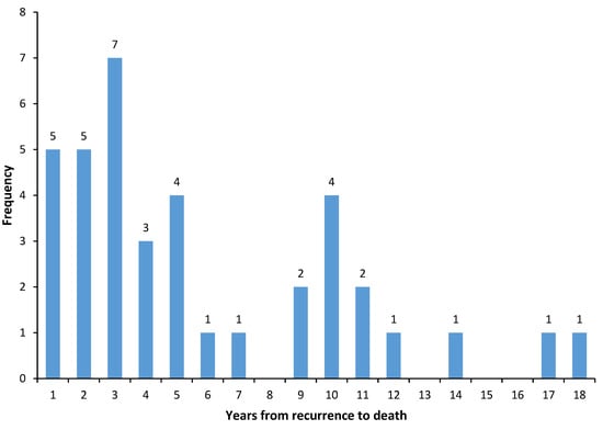 Patients with early recurrences, defined as within 24 months, have a worse prognosis than those occurring after more than 48 months []. On average, studies report a two-fold increased risk of death for patients who develop a local recurrence within two years versus after two years []. In our study, 19 of 135 patients experienced a local recurrence within two years of primary diagnosis (14%), and these 19 patients accounted for half of the 38 deaths. The risk of death from breast cancer persisted for 20 years post local recurrence. The wide extended risk time frame was necessary to follow patients diagnosed with isolated local recurrence more than two years after initial diagnosis. Studies with only ten years of follow-up from the time of initial diagnosis are insufficient to capture this risk.