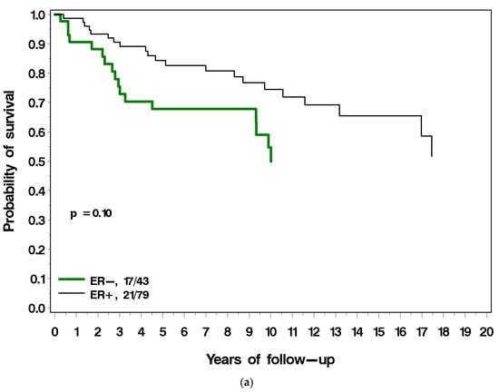 A second question regards the re-staging of hormone receptor status on the recurrence. Although the receptor statuses of the primary and the local recurrence are correlated, about 10–20% are discordant (10% change from positive to negative and 10% from negative to positive) []. In several studies, the receptor status of the recurrence was identified as the best predictor (i.e., as opposed to the status of the primary) of treatment benefit [,,]. This underscores the need for receptor status of the recurrence to be evaluated and utilized as a guide in the selection of therapy. For example, in relation to chemotherapy benefit in the CALOR trial, ER-negative status of the recurrence was strongly predictive of benefit []. A change from ER-negative to ER-positive in the local recurrence may support the use of hormonal therapy.