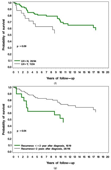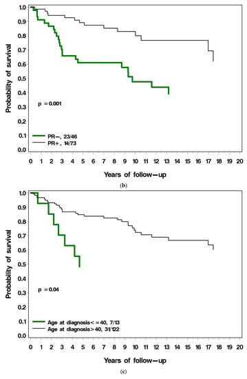 Factors that have been associated with mortality after local recurrence in previous studies include time to recurrence, ER status of primary, node status of primary, size of primary tumour and LVI (in primary and/or recurrence) initial surgery (mastectomy vs. lumpectomy) [,,,] and the initial use of radiotherapy []. In our earlier study of unselected patients [], five variables were significant independent predictors of death after local recurrence: short time from initial diagnosis to local recurrence, positive lymph node status, negative PR status, young age at recurrence, and locoregional compared with local recurrence.