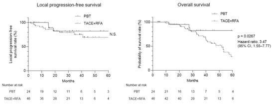 Local progression-free survival (PFS) and overall survival (OS) of PBT and TACE + RFA treatment for patients with HCC. (left) Kaplan–Meier curves of local PFS and (right) OS for PBT and TACE + RFA treatment for patients with HCC. CI, confidence interval; HCC, hepatocellular carcinoma; PBT, proton beam therapy; PFS, progression-free survival; OS, overall survival; TACE, transcatheter arterial chemoembolization; RFA, radiofrequency ablation; N.S., not significant.