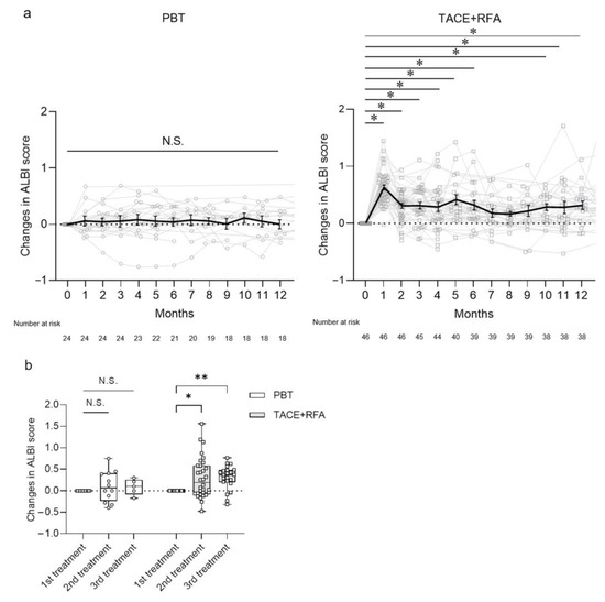 Long-term course of ALBI score after PBT and TACE + RFA treatment in patients with HCC. (a) Changes in ALBI score after PBT and TACE + RFA treatment for 12 months. Solid black line represents the means ± SE. (b) Changes in ALBI score after PBT and TACE + RFA treatment in second- and third-line treatments of HCC. Each value represents the box and whisker plot (highest, third quartile, median, first quartile and lowest value). (a,b) Tukey–Kramer post-hoc test. * p < 0.05, ** p < 0.01, N.S., not significant. ALBI, albumin-bilirubin; HCC, hepatocellular carcinoma; PBT, proton beam therapy; TACE, transcatheter arterial chemoembolization; RFA, radiofrequency ablation.