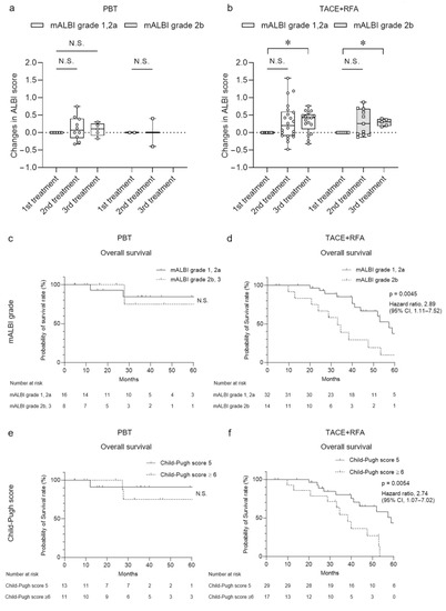 Changes in ALBI score and overall survival classified by hepatic reserve after PBT or TACE + RFA treatment. (a,b) Changes in ALBI score after PBT and TACE + RFA treatment classified by mALBI grade in second- and third-line treatments of HCC. Each value represents the box and whisker plot (highest, third quartile, median, first quartile and lowest value). (c–f) Overall survival after PBT and TACE + RFA treatment classified by (c,d) mALBI grade and (e,f) Child–Pugh score. (a,b) Tukey–Kramer post-hoc test. * p < 0.05, N.S., not significant.