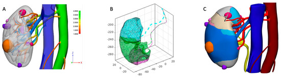 Precise artery segmentation is essential to accurately estimate kidney perfusion regions: the higher the detail of smaller branching, the greater the accuracy of perfusion zone subdivisions. This method allows for determining the final perfusion volumes related to the clampable blood vessels during surgery (Figure 1). All procedures were performed with transperitoneal access by a single experienced surgeon.