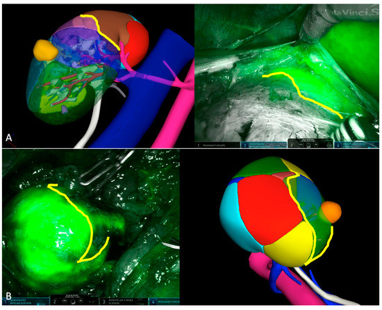 Intraoperative check of selective clamping strategy using near-infrared fluorescence imaging. (A) The boundary lines of perfused parenchyma perfectly reproduce the margins of perfusion zones of the 3DVM at the level of the upper pole of the right kidney. (B) In this second case, the boundary lines depicted via NIRF show similar orientation with those of the 3DVM.