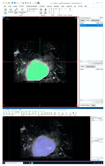 Per the study purpose, to demonstrate the concordance between virtual and real perfusion volumes, superimposition of the 3DVMs over the real anatomy was performed on bidimensional images recorded at the time of surgery. To superimpose the intraoperative ICG view with the 3D model, we used Mimics software, version 21.0 (Materialise, Leuven, Belgium), uploading a screen extrapolated from the intraoperative video. The areas maintaining perfusion on the virtual model were selectively overlaid on the endoscopic image during the ICG injection to verify the concordance between the boundary lines (Figure 2A,B). Moreover, their relative areas were automatically calculated using dedicated software, which could perceive pixels of the same color from a bidimensional image (Figure 3).