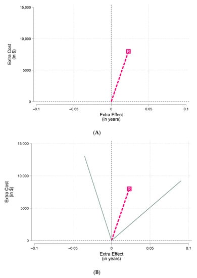It is possible to illustrate the ICER on the cost-effectiveness plane, which has extra cost on the vertical axis and extra effect on the horizontal axis. At point (0,0), there is equal cost and effect to usual care or the comparison group. The ICER estimate is the slope of the ray from the origin to the point at (ΔE, ΔC), represented by “R”, where ΔE is the estimate of the extra effect and ΔC is the estimate of the extra cost. In this case, the ICER equals the slope of the dashed line in Figure 1A that extends from (0,0) to (0.02293, USD 7980.19).