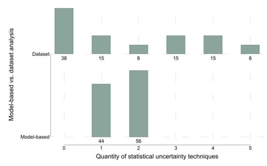 Figure 4 highlights the variability in the ways authors express statistical uncertainty in their papers. All model-based analyses (bottom row) presented uncertainty using either one or two ways (44% and 56%, respectively), with all model analyses providing readers with uncertainty results. In contrast, the majority of analyses of datasets (38%) did not show statistical uncertainty for cost-effectiveness statistics. However, when these types of papers did show uncertainty results, nearly 75% used more than one method (i.e., conditional probability calculated as (8 + 15 + 15 + 8)/(15 + 8 + 15 + 15 + 8)).