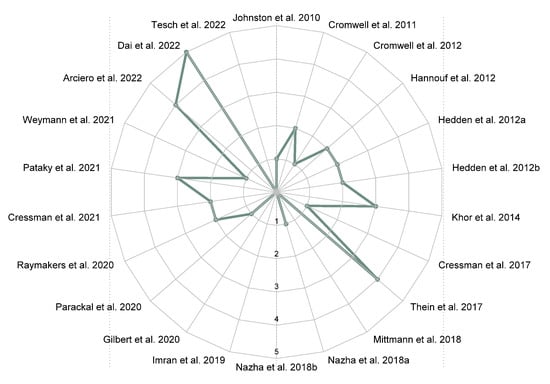 The radar graph in Figure 5 is ordered by date, with the oldest article positioned at 12 o’clock and papers trending toward the present in a clockwise order. The innermost point of the plot (at the center of the circle) indicates using none of the five methods of communicating uncertainty discussed in the Background section. Moving outwards away from the center of the circle shows how many methods were used. In 2014, Khor et al. was the first author to use more than one method to show uncertainty, with three methods counted [24] We also see that only three papers [25,32,33] used four or more methods (i.e., papers by Thein et al., Arciero et al., and also Dai et al.). Observing the pattern in the radar plot suggests there is no trend over time in the incorporation of uncertainty. However, when a member of the Pharmacoeconomics Research Unit established at Cancer Care Ontario (subsequently Ontario Health in 2019) appears as an author, the paper was observed to have larger numbers of uncertainty graphs.