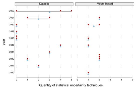 Through time, there is not a clear trend in how authors characterize statistical uncertainty with regards to cost effectiveness. Figure 6 is organized by year on the vertical axis and quantity of uncertainty techniques on the horizontal axis to illustrate the lack of trends in characterization over time. Additionally, studies are separated by whether they used a dataset or were model-based. Circles indicate individual studies’ use of uncertainty methodologies, and triangles indicate where the average laid for the year’s publications. There is much less spread in the papers that utilized models (i.e., the right panel in Figure 6). While all models used at least one form of expressing their uncertainty results, when analyses of cost-effectiveness datasets did report them, we see that they often used more than one method. This was particularly evident in the most recent papers, published in 2022, where the average number of methods was three.
