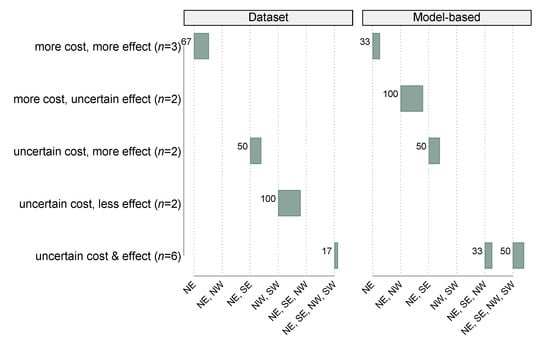 Figure 7 summarizes the location and meaning of the uncertainty reported in the papers we reviewed that presented their results with a scatterplot (specifically with extra cost on the vertical axis and extra effect on the horizontal axis) [13,14,15,16,18,20,21,22,23,24,32,33]. Of the 15 total scatterplots [18], 9 (60%) were based on models and 6 (40%) on datasets. Only 11% of the models showed uncertainty confined to one quadrant [18], indicating high certainty in the results, while considerably more (33%) of the non-modeling papers have uncertainty confined to one quadrant [24,33]. When uncertainty was confined to one quadrant [18,24,33], it was only in the North-East quadrant, strongly suggestive of a new treatment that is both more expensive and more effective.