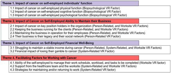 26]. During the initial “in vivo” coding process, codes were captured using concise and descriptive labels relevant to the research questions. Some codes, such as “putting my professional license at risk with my difficulty when needing to think” and “having job fatigue,” were grouped together under the “Impact of cancer on health” category. Other categories were also created to group the codes, which were further organized under sub-themes contributing to the candidate theme, which in the example above became “Impact of cancer on self-employed individuals’ function”. The expanding list of codes was periodically reviewed by the team. M.P.’s (co-author) extensive personal and professional experience with cancer and vocational rehabilitation provided valuable insights and feedback on the codes generated during the study, ensuring that the codes accurately captured the complex phenomena studied and were meaningful and relevant to the research questions.