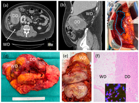 Case example of retroperitoneal liposarcoma. (a,b) Axial and sagittal CT scan images showing likely high-grade or dedifferentiated (DD) and low-grade or well differentiated (WD) components of the tumor, abutting the right kidney (K); (c) intraoperative photograph after resection showing original area of tumor (blue dotted shape) with preserved right kidney (K), duodenum and head of pancreas (*). Organ-preservation is considered on an individual case basis; (d) gross resection specimen demonstrating one intact tumor with WD, DD components and some incorporated, normal-appearing adjacent fat; (e) sectioned gross tumor showing in this case, clear demarcation of WD and DD; (f) photomicrograph (40×) of tumor histology showing clear demarcation of WD and DD, inset showing MDM2 amplification by fluorescence in situ hybridization, confirming the diagnosis. This patient did not receive neoadjuvant or adjuvant therapy.
