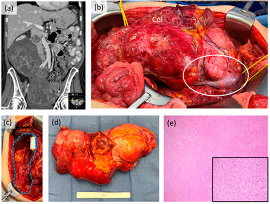 Case example of retroperitoneal leiomyosarcoma. (a) Coronal CT scan image showing large tumor extending into the pelvis with intraluminal tumor extension in the inferior vena cava; (b) intraoperative photograph prior to resection showing gross involvement of the right colon (Col) and intracaval tumor component (white circle). The right kidney was also involved; (c) intraoperative photograph after resection showing original area of tumor (blue dotted shape) with in-line IVC graft reconstruction performed by vascular surgery; (d) gross resection specimen; (e) photomicrograph (40×) of tumor histology, inset (200×). This patient received neoadjuvant systemic therapy with good response radiologically, clinically and pathologically.