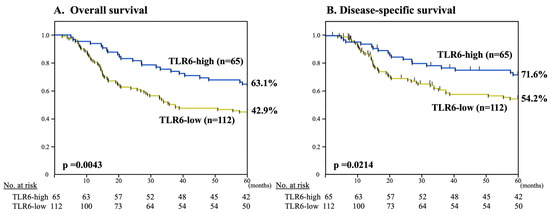 All 89 censored cases were followed up for 60 months. Kaplan–Meier curves illustrating the association between TLR6 expression status and survival are shown in Figure 3. High TLR6 expression was associated with significantly better 5-year OS and DSS (p = 0.0043 and p = 0.0214, respectively).
