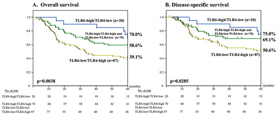 Our previous data of the two groups, TLR4-high (n = 132) and TLR4-low (n = 45), are summarized in Supplementary Table S1 [14]. In total, 25 patients exhibited combined TLR6-low/TLR4-low expression (14.1%), 87 patients exhibited TLR6-low/TLR4-high expression (49.2%), 20 patients exhibited TLR6-high/TLR4-low expression (11.3%), and 45 patients exhibited TLR6-high/TLR4-high expression (25.4%). There was no statistical correlation between TLR6 and TLR4 expression statuses (p = 0.21). Patients exhibiting combined TLR6-low/TLR4-high expression had much worse 5-year OS and DSS than other patients (p = 0.0038 and p = 0.0285, respectively) (Figure 4). Consistent with the results of 5-year OS and DSS, the patient survival rate was twice as high among TLR6 high/TLR4-low patients (60.0%) than among TLR6 low/TLR4-high patients (33.3%) (Table 3).