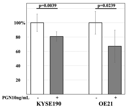 KYSE190 and OE21 showed significantly decreased cell proliferation activity after 10 ng/mL of PGN treatment compared to the control (p = 0.0039 and p = 0.0239, respectively).