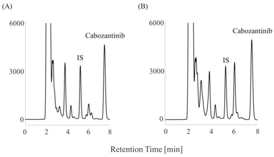 Chromatograms of a patient who received 20 mg of cabozantinib. (A) plasma sample and (B) serum sample.