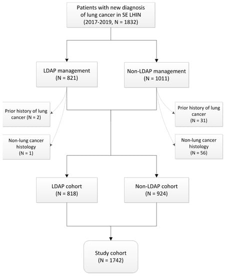 Cases were defined as patients over 18 years of age with a new diagnosis of LC between 1 January 2017 and 31 December 2019, identified by first topography and morphology coding consistent with LC in OCR. Patients were excluded from the study if they did not have data in OCR, were diagnosed with LC recurrence (i.e., defined by clinical assessment, radiologically, or pathologically as recurrence rather than a new primary), were diagnosed outside of the study period, had a non-LC histology type, or resided outside of the SE-LHIN. One patient with synchronous diagnoses of adenocarcinoma and squamous cell carcinomas was excluded from the histologic-type summative data (Table 1) as well as the univariate and multivariate analyses (Table 2 and Table 3) and factors associated with LDAP management analysis (Table 4) where histologic data are used in the analysis.