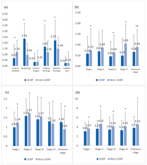 LDAP-managed patients had fewer visits to internal medicine specialists compared with the non-LDAP cohort (0.67 ± 1.15 visits/patient in the LDAP-managed cohort vs. 1.20 ± 1.68 visits/patient in the non-LDAP-managed cohort, p < 0.0001), but had more visits to respiratory specialists (2.34 ± 1.33 visits/patient LDAP vs. 0.94 ± 1.45 visits/patient non-LDAP, p < 0.0001) (Figure 2). Patients in the LDAP cohort also had significantly more specialist visits to both medical (MO) and radiation oncology (RO) than patients in the non-LDAP cohort (1.66 ± 1.86 visits with MO/patient, 2.19 ± 1.75 visits with RO/patient in the LDAP-managed cohort vs. 1.18 ± 1.61 visits with MO/patient, 1.49 ± 1.66 visits with RO/patient ±1.66 in non-LDAP cohort). Specialist visits to thoracic surgery and palliative care were similar between groups (Figure 2).