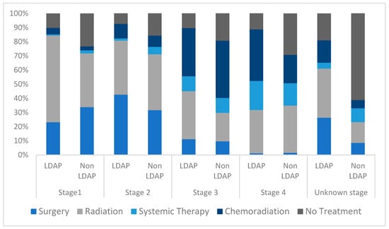 The type of treatments received varied according to whether initial patient management occurred through the LDAP or not. Compared with the non-LDAP cohort, a greater proportion of stage I LC patients in the LDAP cohort received radiation therapy and a greater proportion of non-LDAP patients underwent surgery. Meanwhile, in stage II disease, a greater proportion of LDAP patients underwent surgery. In stage III disease, a greater proportion of LDAP patients received upfront radiation therapy alone, while slightly more patients underwent combined modality treatment in the non-LDAP cohort. A greater proportion of patients with stage IV LC received combined modality (chemoradiation) in the LDAP cohort whereas a greater proportion of patients managed outside of the LDAP received systemic therapy alone. In patients with unknown-stage LC, a higher percentage of patients in the LDAP cohort underwent surgery, radiation, and combined modality treatment (Table 5 and Figure 3).