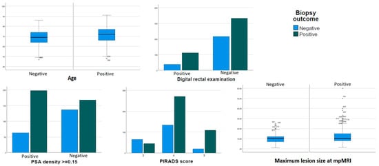 The patients’ baseline characteristics are detailed in Table 1. The median patients’ age was 71 years (IQR 65–76); median PSA was 6.6 ng/mL (IQR 5.0–9.5); median PSA-d was 0.14 (IQR 0.09–0.21); and median prostate volume was 48.5 cc (IQR 35–69). A positive digital rectal examination (DRE), performed by the urologist in charge of the biopsy just before the procedure, was reported in 20% of patients. A total of 168 patients (22.8%) had 1 or more previously negative prostate biopsies. A single mpMRI target was identified in 73.9% of cases, with a mean diameter of 11.5 mm (SD 6.2). The remaining 26.1% of cases harbored 2 targets in mpMRI. Suspicious lesions in mpMRI were scored as 3, 4, and 5 in 14.9%, 55.0%, and 17.5% of cases, respectively. The CDR was 63.2% for all cancers and 58.7% for csPCa, with most cancers being diagnosed as ISUP 2 (42.8%) and 3 (31.0%). When comparing patients with positive and negative prostate biopsy results, statistically significant differences were found in age, PSA density, positive DRE, prostate volume, and target area characteristics (number, size, and PI-RADS score). These differences are graphically presented in Figure 1.