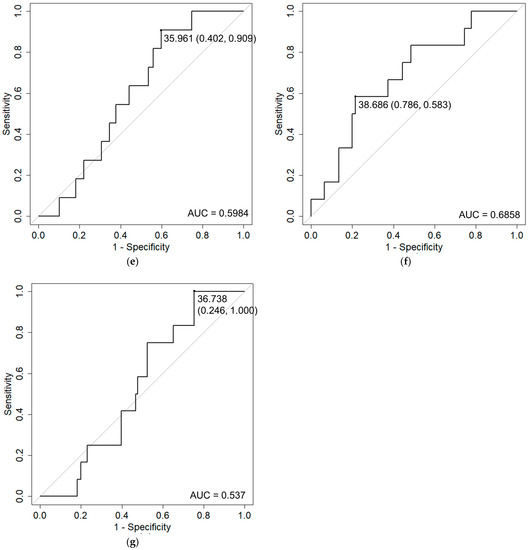 Receiver operation characteristic (ROC) curve analysis of Grade 2 adverse events and detected risk factors. ROC curves with cut-off values (specificity, sensitivity) and area under the curve (AUC) values are shown for: (a) acute GU and prostate volume; (b) acute GI and rectum D10 cc; (c) acute GI and rectum V30 Gy; (d) late GI and rectum D0.1 cc; (e) late GI and rectum D1 cc; (f) frequency and Dmax of bladder; and (g) rectal hemorrhage and rectum D0.1 cc.