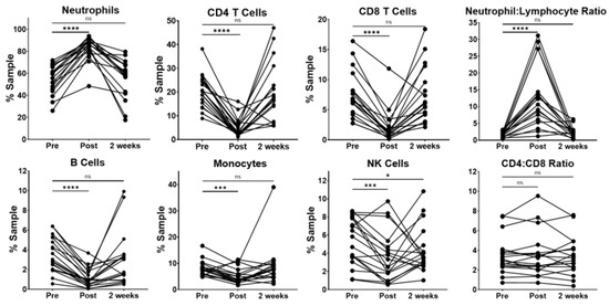 Lung resection results in the transient increase in neutrophils, but a stable CD4–CD8 ratio. Matched dot plots of each cell type, the neutrophil-to-lymphocyte ratio (NLR) and CD4-to-CD8 ratio at three time points, from prior to surgery (Pre, n = 19), immediately following surgery (Post, n = 19) and 2 weeks after surgery (2 weeks, n = 18). Dots connected by lines indicate individual patients. There is a statistically significant increase in the percentage of neutrophils immediately following surgery and a corresponding decrease in all other cells types. These frequencies return to baseline for all cell types 2 weeks after surgery, except for a slight continued decrease in NK cells (mean 5.4% vs. 4.4%, p < 0.05). There is a transient, variable increase in the NLR in patients immediately after surgery, with no significant change by 2 weeks. The CD4–CD8 T cell ratio remained relatively stable in patients across the three time points. Significance determined via paired Student’s t tests. ns: non-significant, * p < 0.05, *** p < 0.001, **** p < 0.0001.