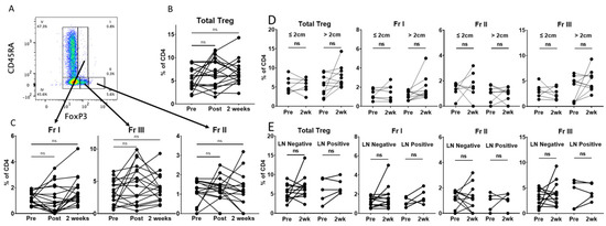 Circulating Treg proportions are stable within 2 weeks of lung tumor resection. (A). Representative manual gating strategy for peripheral blood CD45+CD3+CD4+ cells with the Treg panel to identify the Treg subsets, as described by Miyara et al., 2009 [20]. (B). Matched dot plots demonstrating no significant difference immediately post-surgery (n = 18) or at 2 weeks (n = 17) for total Tregs. (C). Matched dot plots demonstrating no significant difference in the Treg subsets post-operatively or 2 weeks after surgery. (D). Matched dot plots demonstrating no significant difference in total Tregs or the Treg subsets 2 weeks after surgery when stratified by tumor ≤2 cm (n = 7) vs. >2 cm (n = 10). (E). Matched dot plots demonstrating no significant difference in total Tregs or the Treg subgroups 2 weeks after surgery when stratified by LN-negative (n = 12) and LN-positive (n = 5) tumors. Dots connected by lines indicate individual patients. Fr I (resting Treg): CD45RA+FoxP3+CD25+, Fr II (activated Treg): CD45RA-FoxP3++CD25+, Fr III (mixture of Treg and non-Treg): CD45RA-FoxP3+CD25+. Significance determined via paired Student’s t tests. ns: non-significant.