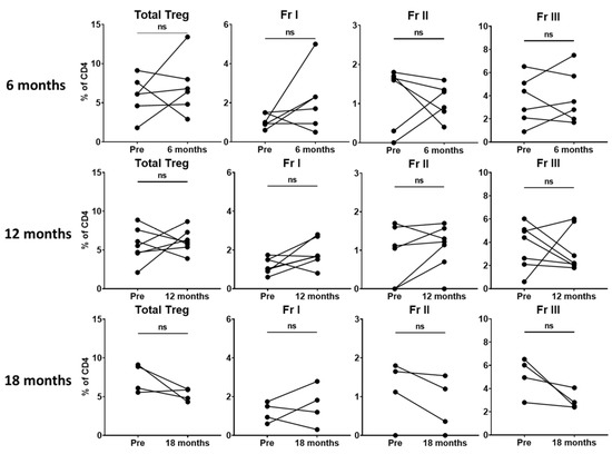 Circulating Treg proportions do not significantly change long-term following surgery. Matched dot plots demonstrating no significant differences in total Tregs or the three Treg fractions at 6 months (n = 6), 12 months (n = 7) or 18 months (n = 4) in patients with available data. Dots connected by lines indicate individual patients. Fr I (resting Treg): CD45RA+FoxP3+CD25+, Fr II (activated Treg): CD45RA-FoxP3++CD25+, Fr III (mixture of Treg and non-Treg): CD45RA-FoxP3+CD25+. Significance determined via paired Student’s t tests. ns: non-significant. Data are from 10 individual patients.