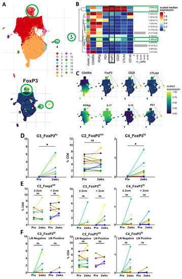 Unsupervised clustering of unstimulated cells reveals three CD4+ Foxp3-expressing clusters. (A). UMAPs of the unsupervised clustering of patients of concatenated files of unstimulated CD4+ cells at the pre-resection, post-resection and 2-week time points, n = 19 individual patients. In the upper UMAP, each cluster has a corresponding number and color. The lower UMAP demonstrates the relative expression of FoxP3. Green circles highlight the three Treg clusters (2, 3 and 4). (B). Heatmap demonstrating the relative scaled median marker expression, cell number and percentage of the total sample of each of the fifteen CD45+CD4+ clusters. Clusters 2, 3 and 4 have expression of FoxP3, CD25 and CTLA-4, indicating that they are Tregs. Green bars highlight the three Treg clusters. The black bar highlights the relative expression of FoxP3. (C). UMAPs demonstrating the scaled, relative expression of additional markers used to generate the fifteen CD4+ clusters. Black arrows highlight the Treg clusters with the expression of the separate markers used. (D). Matched dot plots (n = 16 patients) demonstrating no significant change in the predominant cluster, C2_FoxP3int, with a significant increase in the two small FoxP3hi clusters (C3_FoxP3hi and C4_FoxP3hi), two weeks after surgery. (E). Matched dot plots demonstrating no significant change in the three unsupervised Treg clusters when stratified by tumor size at two weeks after surgery (tumor ≤ 2 cm, n = 8; tumor > 2 cm, n = 8). (F). Matched dot plots demonstrating no significant change in the three unsupervised Treg clusters when stratified by lymph node status at two weeks after surgery (LN negative, n = 12; LN positive, n = 4). Dots connected by lines indicate individual patients, each color is an individual patient. Significance determined via paired Student’s t tests. ns: non-significant, * p < 0.05. LN: lymph node.