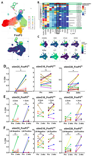 Having found phenotypically similar populations to standard gating with unsupervised clustering, we investigated the potential changes in the functional state of Tregs after surgery. We performed analyses and the unsupervised clustering of cells that had undergone stimulation in vitro with PMA and ionomycin, which activates cytokine production. Thirteen patients had matched pre-resection- and 2-week time-point stimulated data for analysis. As expected, the clustering of the stimulated cells also revealed three distinct FoxP3+ populations, with a predominant cluster presenting an intermediate expression of FoxP3 (stimC10_FoxP3int) and two small clusters with a high FoxP3 expression (stimC5_FoxP3hi and stimC20_FoxP3hi) (Figure 5A–C). The cells in stimC10_FoxP3int were CD45RA-negative, with a relatively low expression of CD25, RORγt and IL-17. These cells are likely the stimulated version of C2_FoxP3int from the unstimulated clustering, and a mix of Treg and cytokine-producing non-Treg cells [10,20]. The cells in stimC10_FoxP3int did not change significantly within 2 weeks of surgery or vary by tumor size or lymph node status (Figure 5D–F).