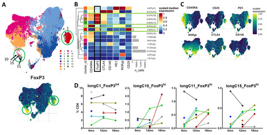 To evaluate if similar unsupervised clustering populations existed beyond the immediate perioperative period, cells from patients with longer-term samples (≥6 months from surgery, n = 10 individual patients with 18 time points) were clustered. Similar to the perioperative clustering of unstimulated cells, this revealed a predominant cluster with an intermediate expression of FoxP3, CD45RA-negative, a high expression of CD25 and a low/intermediate expression of CTLA-4 (longC1_FoxP3int) (Figure 6). This clustering, however, identified three small FoxP3hi clusters: longC10_FoxP3hi, longC11_FoxP3hi and longC15_FoxP3hi. These small populations seemed to cluster by their variable expression of CD45RA, CTLA-4 and RORγt. Unlike within the perioperative period, none of the four clusters demonstrated a significant expression of PD-1 or CD146. Similar to the perioperative samples, the cells in the predominant cluster, longC1_FoxP3int, seemed to remain relatively stable across time points, and there was noted variability of the frequencies of the three small FoxP3hi clusters (longC10_FoxP3hi, longC11_FoxP3hi and longC15_FoxP3hi) among the patients. These data, similar to our findings from standard gating, suggest that the majority of circulating Tregs at the later time points after surgery remain in a predominant, stable cluster with intermediate FoxP3 expression, while small proportions of Tregs with a high expression of FoxP3 are more varied. Unfortunately, the small number of samples at each of the longer-term timepoints prevents meaningful statistical analysis.