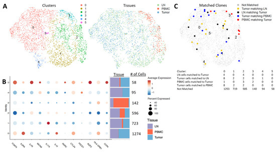 Paired single-cell RNA/TCR sequence clustering reveals six CD4+ Foxp3-expressing clusters within the blood, tumors and lymph nodes. (A). UMAPs of unsupervised clustering of patients (n = 5) from single-cell RNA sequencing analysis from combined peripheral blood (PBMCs), tumors and lymph nodes (LNs) of CD4+FoxP3+ cells. The left UMAP demonstrates the six clusters, with each cluster having a corresponding number and color. The right UMAP highlights the tissues that make up each cluster. (B). Dot plots showing the relative gene expression of the six CD4+FoxP3+ clusters, the cell number in each cluster and the proportion of cells isolated from lymph nodes (LNs), peripheral blood (PBMC) and tumors comprising each cluster. Circle size corresponds to the percentage of cells in each cluster and the color indicates the relative gene expression (high = red, low = blue). (C). UMAP highlighting the numbers of matched clones in each cluster by single-cell TCR sequencing. Colored dots indicate a clonal match corresponding to the associated key, and grey dots indicate the clones that are not matched across tissue types. The table denotes the exact number of matched clones by tissue in each cluster.