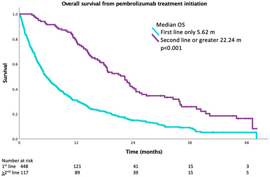 OS of patients from treatment initiation who received pembrolizumab only versus second line or greater therapy.
