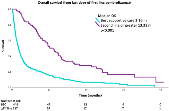 Comparison of OS of patients who had progression on first line pembrolizumab from time of last dose of pembrolizumab who received best supportive care versus second line or greater therapy.