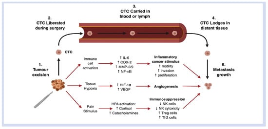 Schematic representation of the pathophysiological mechanisms induced by surgery that promote survival and growth of metastatic deposits formed by circulating tumour cells (CTCs) released intraoperatively. COX-2, cyclo-oxygenase-2; HIF, hypoxia-inducible factor; HPA, hypothalamic-pituitary-adrenal axis; IL-6, interleukin 6; MMP, matrix metalloprotease; NF-kB, nuclear factor kappa B; NK, natural killer cell; Th2, Type 2 helper T cell; Treg, regulatory T-cell; VEGF, vascular endothelial growth factor.