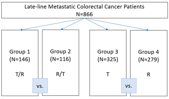 The baseline patients’ characteristics were well-balanced and are summarized in Table 1. A total of 866 consecutive patients with mCRC receiving sequential T and R (T/R (T prior to R), n = 146; R/T (R prior to T), n = 116)) or T (n = 325) or R (n = 279) alone were included in the analysis.
