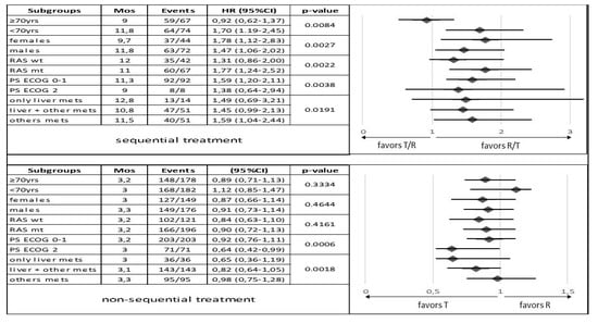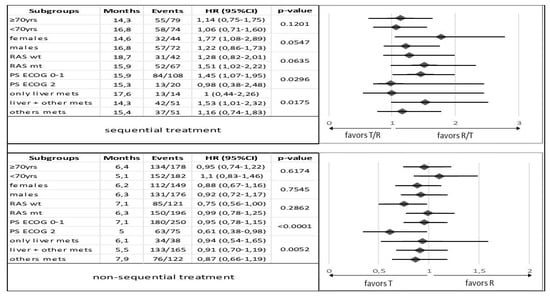 In an exploratory subgroups analysis, we identify a correlation between the R/T sequence and longer mOS and mPFS for patients younger than 70 years (p = 0.1201 and p = 0.0084, respectively), males (p = 0.0547 and p = 0.0027, respectively), wt RAS tumors (p = 0.0635 and p = 0.0022, respectively), ECOG PS = 0–1 (p = 0.0296 and p = 0.0038, respectively), and in patients with liver metastases only (p = 0.0175 and p = 0.0191, respectively) (Figure 3 and Figure 4).