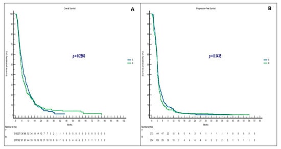 No significant differences in clinical outcomes (mOS and mPFS) were observed between patients receiving T or R alone, which supports the evidence from the literature [,,,,,,] (Figure 5A,B). A statistically significant difference in mOS was observed in subgroup analysis for patients in the T group with non-hepatic metastases (p = 0.0052) and ECOG PS = 0–1 (p = 0.0001). No significant change in mPFS according to subgroups was seen, with the exception of patients with ECOG PS = 0–1 in the T group with p = 0.0006 (Figure 3 and Figure 4).