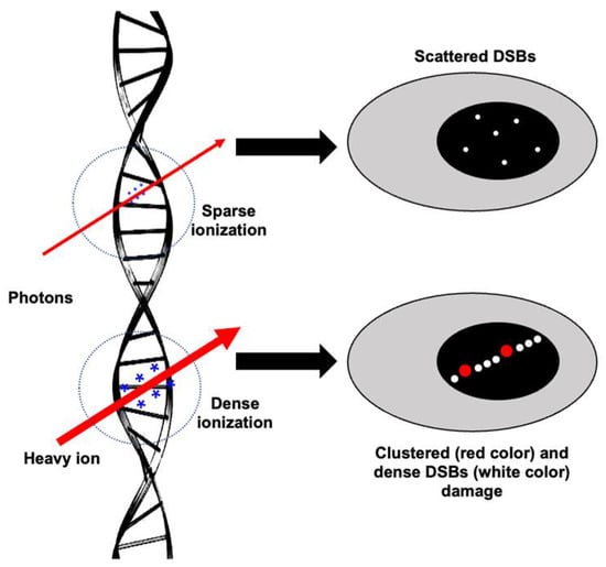 Illustration of ionization events and subsequent damage to DNA after low-LET (photon) vs. high-LET (heavy-ion) radiation. The size of * (in blue) represents the ionization density after photon and heavy ion irradiation. Scattered DSBs are marked with small white dots. Dense DSBs are marked with big white dots, and a red dot represents complex damage (SSB, DSB, and oxidative DNA damage in close proximity).