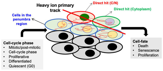 Variability in radiation response (cell fate) due to cell cycle phase at the time of irradiation and heterogeneous damage caused by heavy ions in the cells located in the core and penumbra regions The heavy-ion track is divided into “core” and “penumbra” regions based on the deposited energy density. The penumbra is the area near the edge of an ion beam track where the deposited energy density changes according to the distance from the primary ion track.